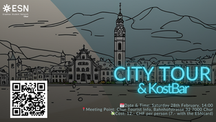 Ready to explore Chur like never before? Join our City Tour on Saturday, 28 February at 14:00. Discover hidden gems, cool stories, and great vibes around the city. We meet at Chur Tourist Info (Bahnhofstrasse 32). After the tour, we head to KostBar for drinks. Registration deadline: 27 February at 12:00. Open event – bring your friends!