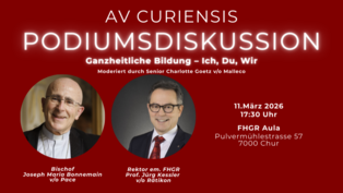 Was bedeutet ganzheitliche Bildung heute? Am 11.03.2026 um 17:30 Uhr lädt die AV Curiensis zur Podiumsdiskussion in der FHGR-Aula in Chur ein. Ein Gespräch mit Bischof Joseph Maria Bonnemain und Prof. Jürg Kessler über Bildung, Werte und Zusammenhalt. Komm vorbei und diskutiere mit! Anschliessend geht es weiter zum Stamm, ab 20 Uhr im Sunshine Pub.