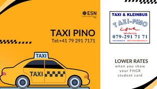 Dank der Zusammenarbeit von ESN Chur und Taxi Pino erhalten alle Studierenden der FH Graubünden bei Vorlage ihres Studierendenausweises den vergünstigten Tarif bei Taxi Pino. Eine 2,5 km Fahrt kostet somit nur 12 CHF statt 22 CHF! Lasst euch dieses Angebot nicht entgehen!